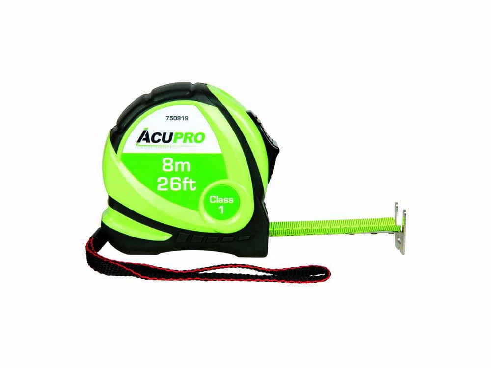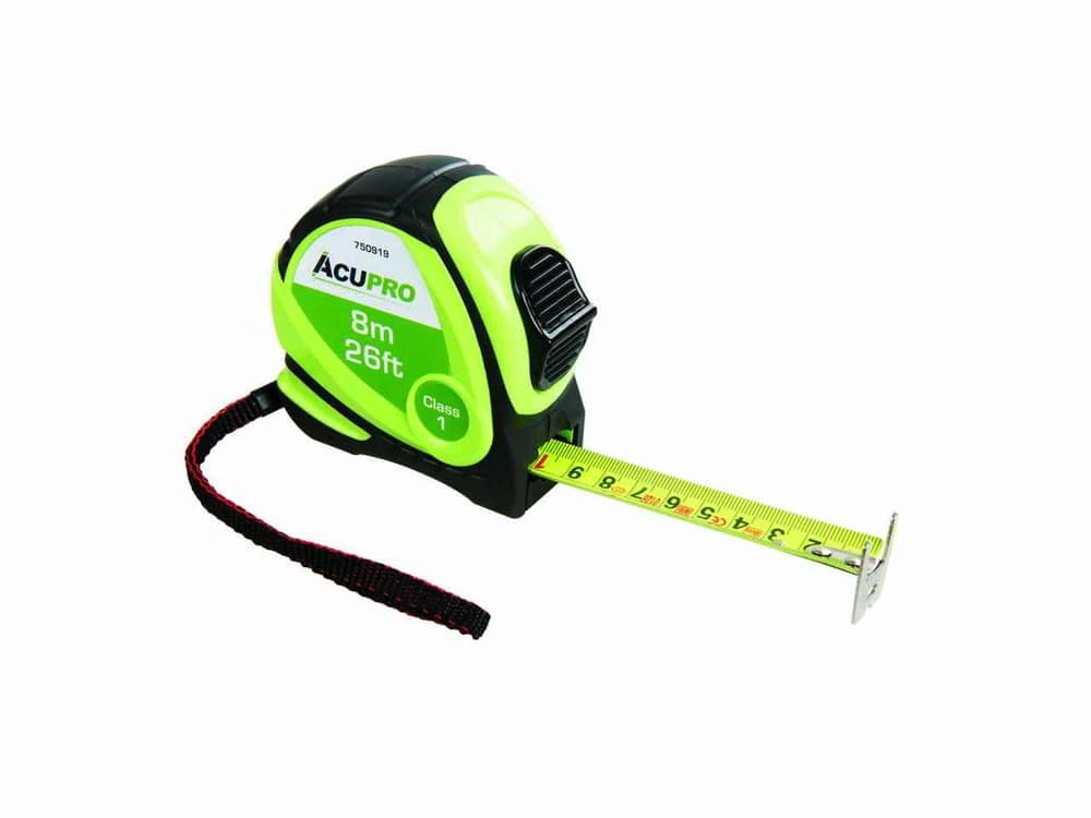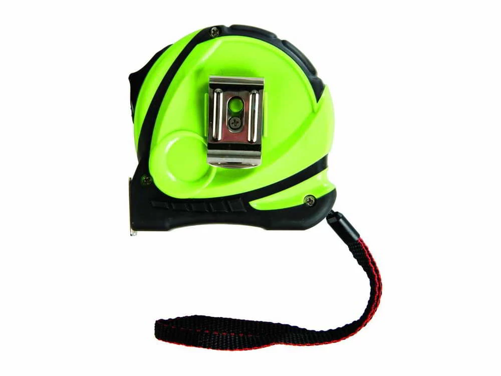 Ergonomisches, schlagfestes Gehäuse mit Gummikapsel für bessere Griffigkeit. Neon-gelbes, gut sichtbares Blatt für vereinfachtes Ablesen. Doppelseitiger Aufdruck mit metrischen und zölligen Einteilungen. Nylonbeschichtetes Qualitäts-Maßband für erhöhte Haltbarkeit und Abriebfestigkeit. Matte Oberfläche vermindert Lichtreflektionen und erleichtert das Ablesen. Beweglicher Endhaken ermöglichen exakte Messungen im Innen- und Außenbereich. Höchste verfügbare EG-Genauigkeitsklasse I. Inklusive Gürtelklemme.