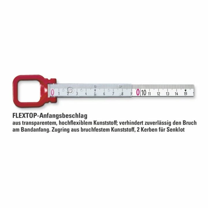 im Alurahmen · eloxiert · weiß lackiertes Bandmaß aus rostgeschütztem Stahl · Aufdruck mm-Teilung bis Bandende · Kurbel ausklappbar · kugelgelagert · ergonomische Form mit Griffnoppen · einklappbarer Kurbelarm und Parkposition für den Bandanfang zum Schutz vor Transportbeschädigungen · mit Flextop-Anfangsbeschlag aus transparentem, hochflexiblem Kunststoff, vermindert zuverlässig den Bruch am Bandanfang · EG-Genauigkeitsklasse II