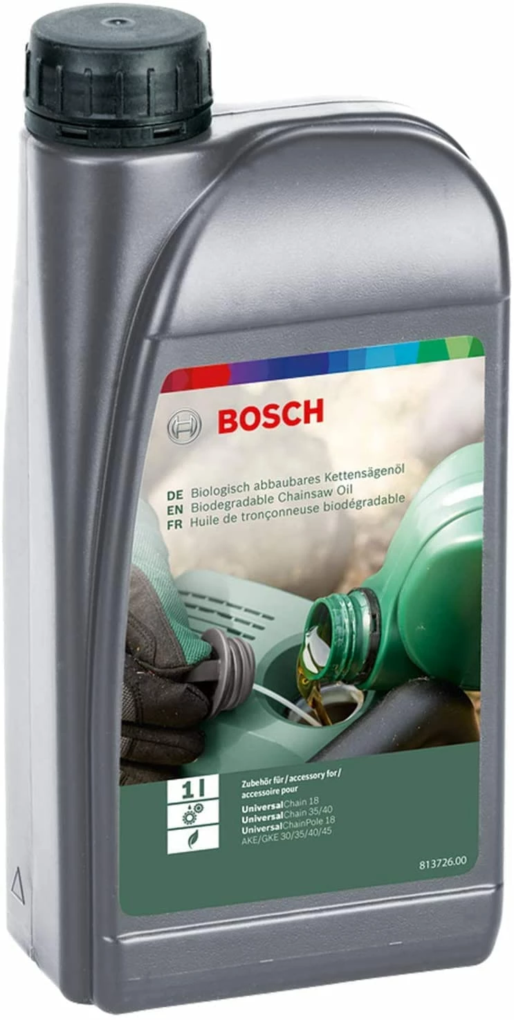 Systemzubehör Kettensägen-Haftöl. Effizientes Ölen, längere Lebensdauer. Verwendbar als Ganzjahresöl. 1 l biologisch abbaubares Öl. Über 90 % erneuerbare Inhaltsstoffe. Geeignet für alle Bosch Kettensägen.