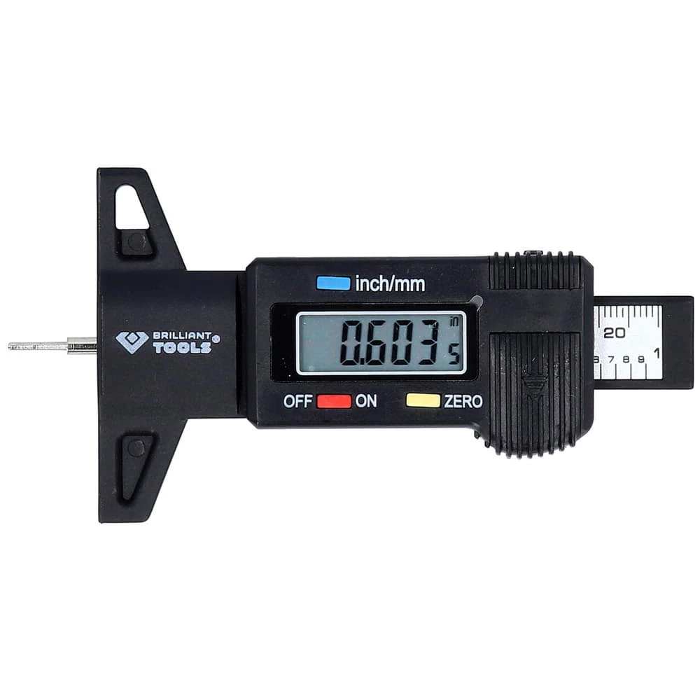 Der digitale Tiefenmessschieber von BRILLIANT TOOLS BT114903 kann zur Messung von z.B. Bohrlöchern, Profiltiefen oder Bremsbelägen verwendet werden. Eine Nullstellung ist hierbei in jeder Position möglich. Die Messanzeige kann das Maß in mm oder Inch anzeigen. Die passende Batterie LR44 ist im Lieferumfang enthalten. Die große LCD-Anzeige kann gut abgelesen werden und die maximale Messtiefe von 25 mm anzeigen.