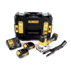 Die Akku-Stichsäge beinhaltet einen Abzugs- und Verriegelungsschalter für variable Geschwindigkeit. Damit kann man schnelle kontrollierte Schnitte durchführen, ausserdem wird die Arbeitssicherheit erhöht. Mit der 4-stufigen Einstellung des Pendelhubes kann die Schnittgeschwindigkeit reguliert und an das jeweilige Werkstück angepasst werden. Der werkzeuglos verstellbare Schuh mit kratzfester Abdeckung kann in beide Richtungen um 45 Grad abgewinkelt werden. Ebenso beinhaltet die Stichsäge ein einfaches und schnelles Klingenwechselsystem. Der weiche Griff bietet zusätzlichen Benutzerkomfort und verringert die Ermüdung des Benutzers. Zusätzlich enthält die Säge eine LED-Arbeitsbeleuchtung, die bei der Sichtbarkeit der Schnittlinie hilft. Ausserdem werden durch das integrierte Gebläse Staub und Spähne vom Werkstück gepustet, wodurch die Sicht auch frei gehalten wird. Der beiliegende Absaugadapter schützt den Arbeitsbereich vor Verschmutzungen, so daß auch in sensiblen Bereichen gesägt werden kann. Inklusive zur Akku Stichsäge gibt es zwei 4,0 Ah Akkus und ein Ladegerät für 10,8 – 18 V Li-Ion Akkus. Der Akku ist kompatibel mit allen 18 V XR Akku-Maschinen von Dewalt. Er besitzt eine LED Akku-Ladestandanzeige und weist eine hohe Lebensdauer und lange Laufzeit auf. Durch die Li-Ion-Technologie besitzt der Akku keinen Memory-Effekt. Das Ladegerät eignet sich für Li-Ion Akkus mit einer Spannung von 10,8V; 14,4V und 18V. Die LED-Anzeige informiert über Akku- und Ladezustand.