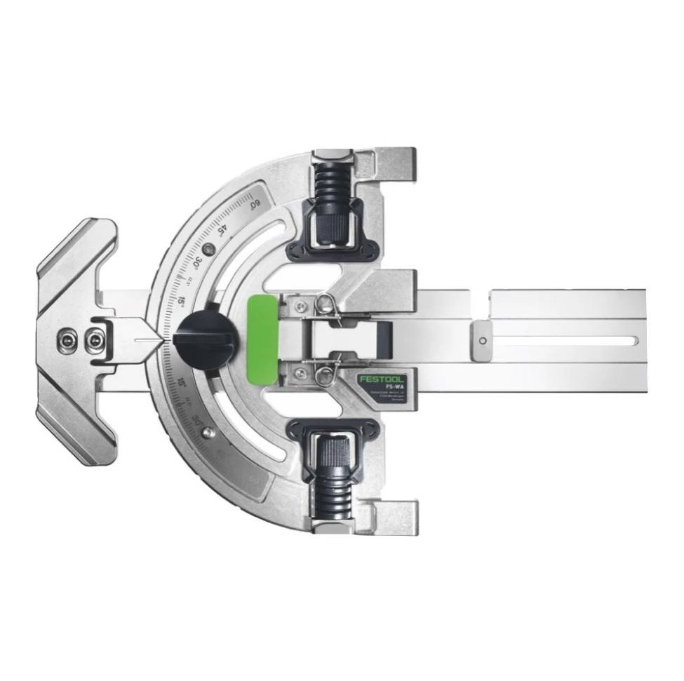 Festool bietet hier mit dem FS-WA Winkelanschlag ein hochwertiges Hilfsmittel für genaueste Winkelschnitte im Bereich von +60º bis -60º. Die lange Anlegekante und das Sichtfenster ermöglichen ein einfaches Ausrichten an der Werkstückkante. Der zusätzliche Anlegebolzen sorgt auch bei abgerundeten Werkstückkanten für einen sicheren Halt. Der Winkelanschlag lässt sich über einen Schnellspannhebel einfach und intuitiv mit der Führungsschiene koppeln. Festool ist ein Premiumhersteller für Elektrowerkzeuge, der sich vor allem durch seine lange Tradition und seine sehr hohe Verarbeitungsqualität auszeichnet.
