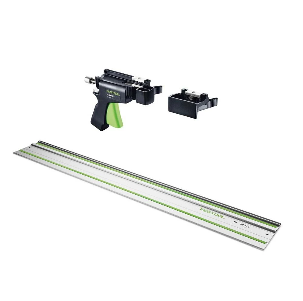 Die FS 800/2 ist eine 800 mm lange Führungsschiene von Festool, die sich für Hand- und Tauchkreissägen eignet. Die Führungsbacken der Tauchkreissägen können werkzeuglos eingestellt werden, wodurch eine spielfreie Führung gewährleistet wird. Eine Gummilippe direkt am Anriss verhindert das Ausreißen der Kanten auch bei Winkelschnitten. Mit einer Kombischmiege zur Führungsschiene können Winkel leicht vom Werkstück oder Wand übertragen werden, für exakte Nuten gibt es einen Führungsanschlag für Oberfräsen. Die Schiene erlaubt ein sicheres und schnurgerades Führen der zu benutzenden Maschine. Dank einer Haftunterlage lässt sich die Schiene gut auf glatten Materialien positionieren und schützt zudem die Werkstückoberfläche vor Beschädigungen. Ein Gleitbelag auf der Schiene erleichtert den Lauf der Maschine. Der Festool Schnellspanner ist für das Spannen und Positionieren der Führungsschiene FS, FS/2 und GRP/2 geeignet. Die gut durchdachte Alternative zum Befestigungen mit Schraubzwingen ist höchst effektiv und Arbeitssparend. Die Spannbacke und der Schnellspanner werden von unten in die Führungsschiene eingeführt, und mit dem Spannmechanismus fest gehalten. Des Weiteren ist ein optimaler Halt durch die gummierten Oberflächen gewährleistet. Die Führungsschiene hat somit einen extrem festen sitzt und verrutscht nicht. Der komfortable Pistolengriff lässt ein lösen im Sekundenbruchteil zu, hierfür muss man lediglich den Federmechanismus lösen. Zusammenfassend kann man sagen, es eine zeitsparende Alternative und im Punkt Kosten Zeit Ersparnis so gut wie unschlagbar zur herkömmlichen Schraubzwinge.