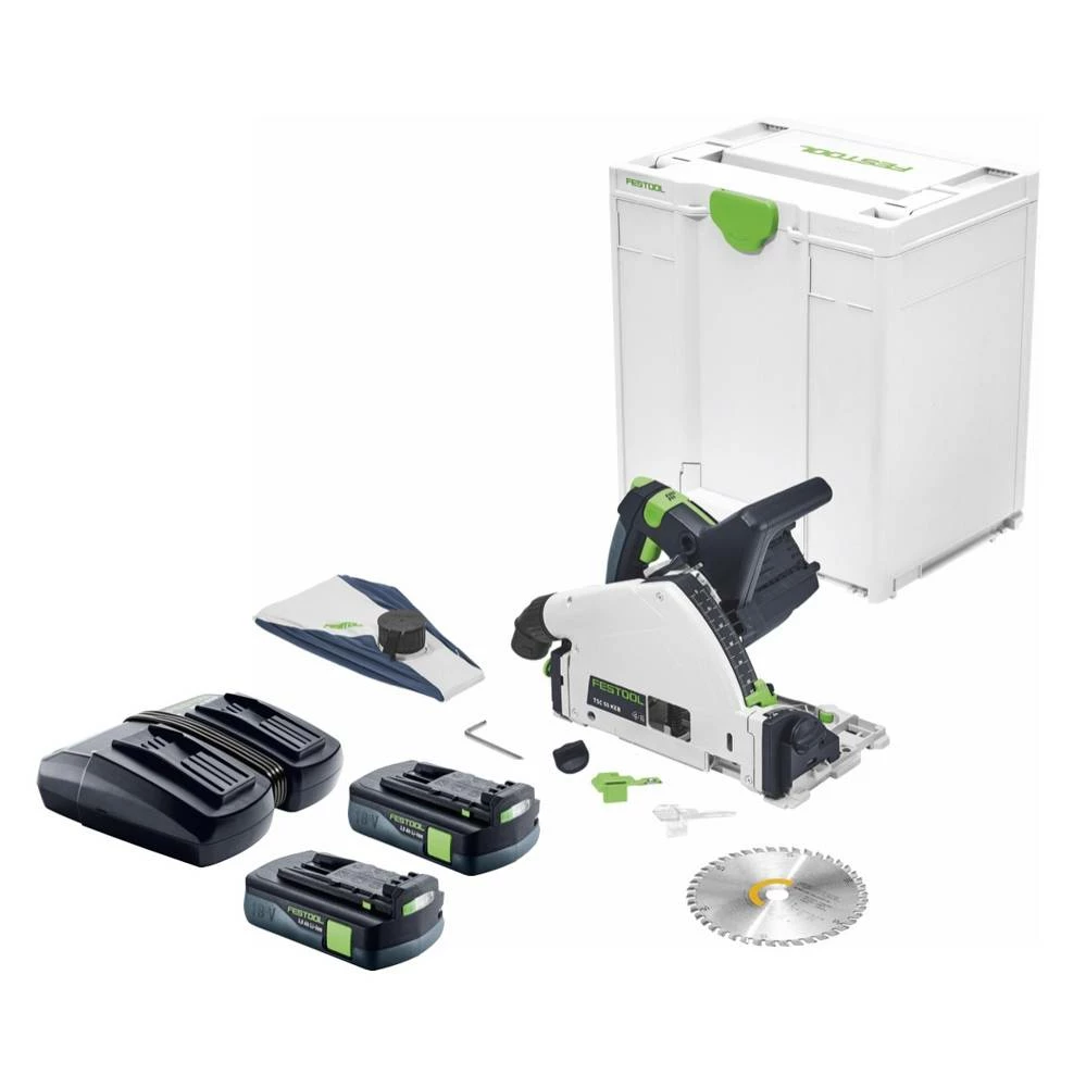 Die Festool Akku-Tauchsäge TSC 55 ist ideal für präzise Tauchschnitte bei einer Materialstärke von bis zu 55 mm und eignet sich perfekt für das Ablängen von Innentüren, zum Sägen von Aussparungen in Türen und Küchenarbeitsplatten, Zuschneiden von Plattenmaterial und zum Herstellen von Dehnungsfugen in Parkettböden und Schattenfugen. Dabei ist die TCS 55 mit der KickbackStop Technologie ausgestattet, welche die Verletzungsgefahr durch einen Rückschlag beim Sägen oder beim Eintauchen in das Werkstück vermindern soll. Sie überzeugt mit einem starken, bürstenlosen EC-TEC Motor, welcher eine hohe Kraftentfaltung bei geringem Energieverbrauch aufweist. So werden sehr hohe Drehzahlen, von bis zu 5.200 Umdrehungen pro Minute und eine perfekte Schnittqualität bei einem schnellen Arbeitsfortschritt erreicht. Der mitgelieferte Staubfangbeutel ermöglicht schmutzfreies und emmissionsloses Arbeiten und mit dem FastFix Spindelstopp lässt sich das Sägeblatt einfach und schnell wechseln. Festool ist ein Premiumhersteller von Elektrowerkzeugen, eine lange Tradition und ausgeklügelte Konzepte zeichnen das Unternehmen aus.
