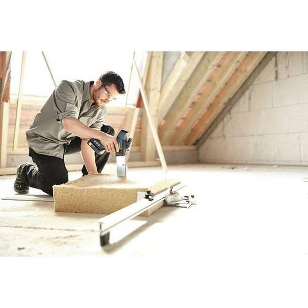 - Winkelgenaue Schnitte von flexiblen Mineral- und Naturfaserdämmstoffen sowie PUR-Dämmstoffen (in Kombination mit der Festool Führungsschiene)