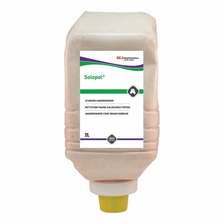 SOLOPOL® ECO’LINEnnEigenschaften: nHandreiniger mit besonders feinkörnigem ASTOPON® bei sehr starken Verschmutzungen; starke Reinigungskraft.nnVerschmutzungsarten: nz. B. Öle, Fette, Ruß, Graphit, Metallstaub, Schmierstoffe.nnBeschaffenheit: nPaste mit Hautschutzstoff EUCORNOL®, besonders hautschonend, mit Aloe Vera, parfümiert.nHinterlässt ein spürbar gepflegtes Hautgefühl.nnBeschreibung auf Etikett zusätzlich in:nBei 2000 ml-Softflasche: GB / ES / PT / TR / PL / HU