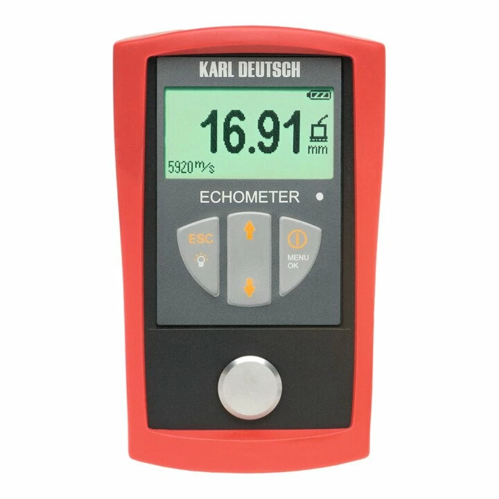 Wanddickenmessgerät Echometer BasisgerätAusführung: Solides Basisgerät zur Messung von Wanddicken und Schallgeschwindigkeiten mit neuester Messtechnik und modernem Design. Das Gerät eignet sich sowohl zur schnellen Qualitätskontrolle in der Produktion als auch zur Messung innen korrodierter Behälter oder Rohrleitungen. Der Wanddickenmessbereich umfasst – abhängig vom Prüfkopf – 0,5 bis 400 mm. Bei der Schallgeschwindigkeitsmessung können problemlos alle schallleitfähigen Materialien mit einem Messbereich von 100 bis über 19999 m/s vermessen werden. Mit großem, hinterleuchtetem Grafikdisplay in 3 wählbaren Anzeigenmodi: Standardanzeige, Differenzwert und Minimalwert, Grenzwertüberwachung mit akustischer und optischer Kontrolle, spritzwassergeschütztes Gehäuse mit stoßabsorbierendem Gummischutzrahmen und Aufstellbügel. Automatiche Prüfkopferkennung. Lieferung mit Betriebsanleitung, 100 ml Koppelmittel ECHOTRACE und 2 Batterien LR44, 1,5 V, im Kunststoffkoffer.Hinweis: Optionale Messwertspeicherung und Datenschnittstelle sowie Software-Pakete („EasyExport“ und „iCom“) auf Anfrage lieferbar.