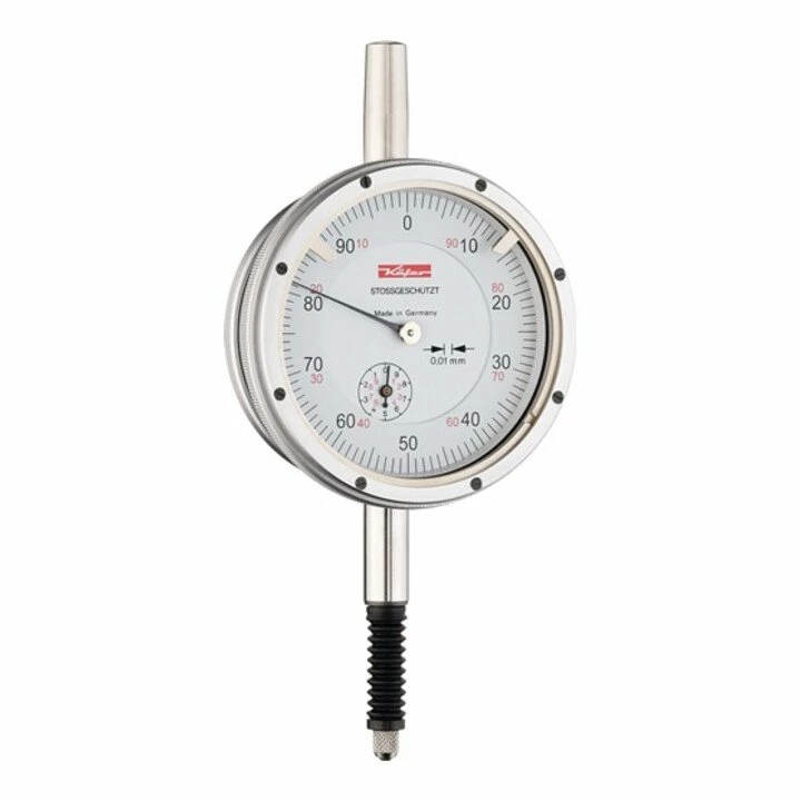 wasser- und öldicht mit Stoßschutz · ein Gummibalg verhindert das Eindringen von Flüssigkeiten und Verunreinigungen an der Eintrittstelle des Messbolzens in den Schaft · die Abdichtung des oberen Messbolzens ist durch eine Schutzkappe mit O-Ring gewährleistet · die Konzeption des Metallaußenringes und dessen Montage ermöglicht einen perfekten Wasserschutz · O-Ringe, ein flaches Deckglas und ein solide aufgeschraubter Messingring sind die besonderen Kennzeichen · zwischen dem drehbaren Außenring und dem Metallgehäuse der Messuhr befindet sich ein O-Ring · die Rückwand ist ebenfalls mit einem speziellen Gummiring abgedichtet · Einspannschaft (Ø 8 mm h6) und Messbolzen aus nichtrostendem Stahl · verstellbare Toleranzmarken · mit 2 Zeigern Weitere technische Eigenschaften: · 1 Zeigerumdrehung: 0,2mm · prüfpflichtig: ja