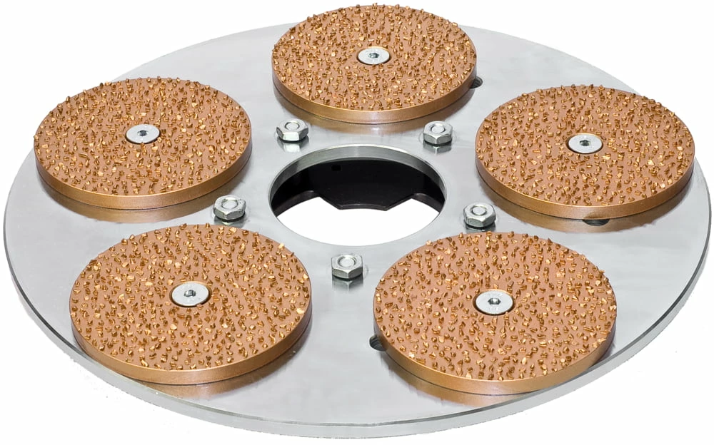 Wolframcarbid-5fach Teller KG14Für grobe Schleifarbeiten auf zementären Untergründen, auf stark versinterten Estrichflächen. Zum Abschleifen von Beschichtungen, Farbresten, Lacken, Isolieranstrichen. Sehr aggressiver Schleifeffekt durch die Drehbewegung der einzelnen Teller und das Gewicht des Tellers – 15kg! Mit 5 Splittellern 127mm auf Stahlgrundteller Ø 400mm. Wolframcarbid-Splitt-5fach Teller ist kompatibel mit weiteren Zubehörsets des Multifunktionstellers!