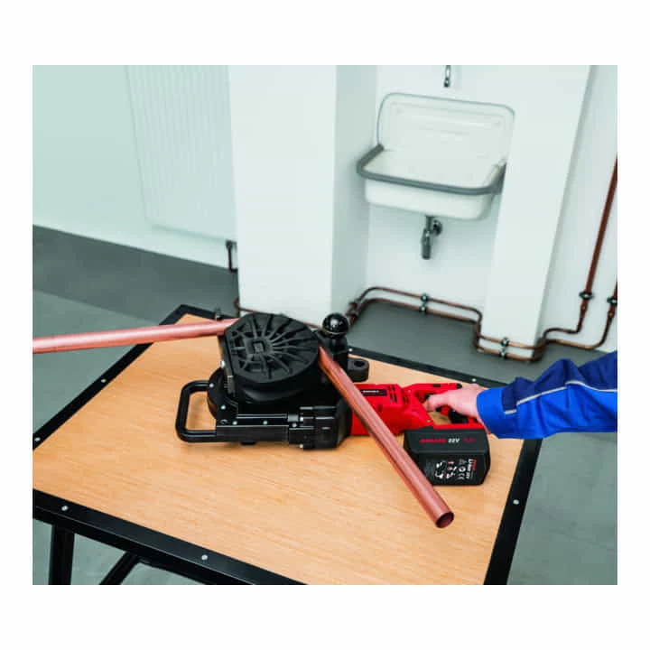 - Leistungsstarker, robuster Elektro-Rohrbieger für harte, halbharte und weiche Kupferrohre (auch dünnwandig), Ø 10–28 mm, dickwandige Kupferrohre K65 EN 12735-1 Ø ⅜–1⅛“, nichtrostende Stahlrohre der Pressfitting-Systeme Ø 12 – 28 mm, C-Stahlrohre der Pressfitting-Systeme Ø 12–28 mm (auch ummantelt), Elektroinstallationsrohre EN 50086 Ø 16–32 mm, Verbundrohre Ø 14–40 mm, u. a. Zum faltenfreien, kalten Ziehbiegen von harten, halbharten und weichen Rohren, bis 180°