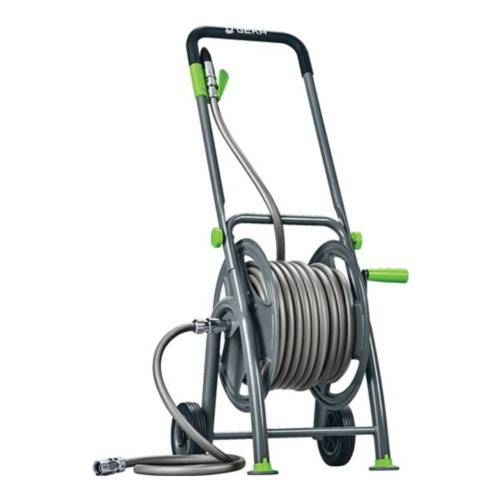 hochwertige, pulverbeschichtete und standfeste Stahlkonstruktion · griffige Luftbereifung · Softgrip und Winkeldreharmatur aus Messing · bestückt mit 25 m Geka 110 Wasserschlauch 1/2″ (13 mm), Original Geka plus Stecksystem, Spritzdüse und Anschlussset 1,5 m für den Wasserhahn · inkl. Hahnstecker G 3/4″ · vormontiert · Temperaturbereich Schlauch : -10 °C bis +50 °C · Temperaturbereich Schlauchwagen: +4 bis +60 °C