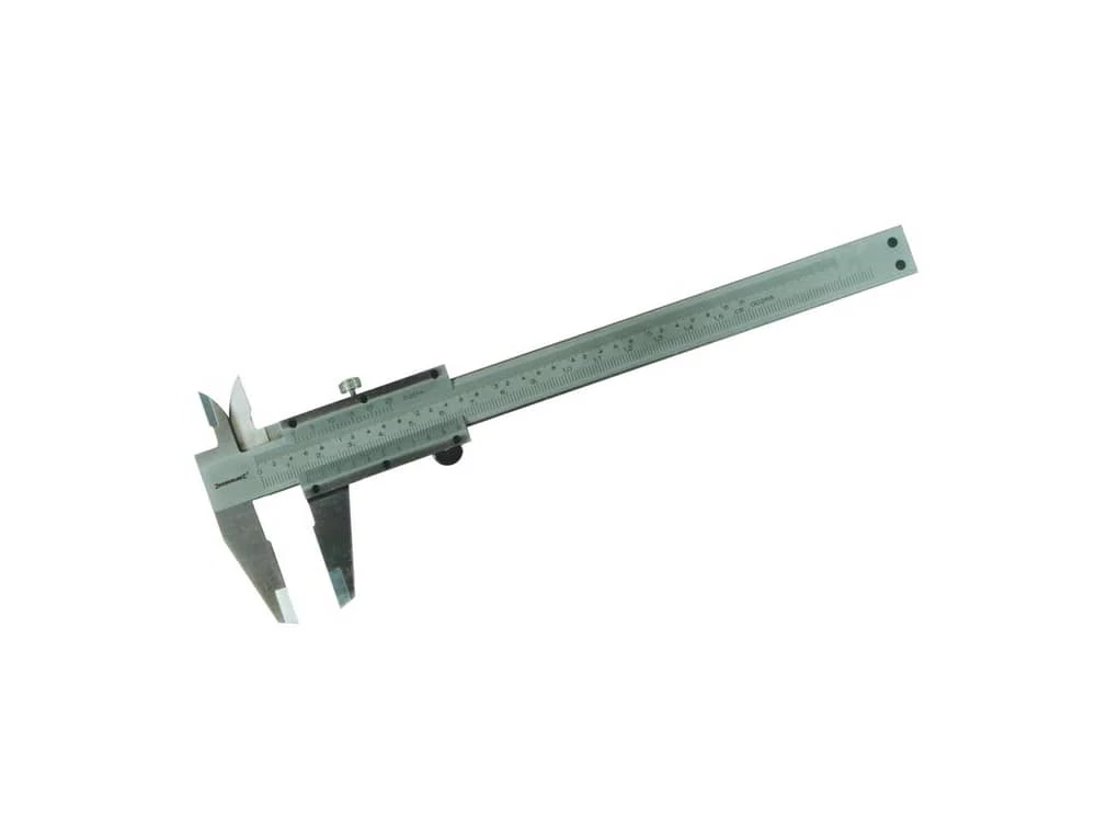Messschieber aus angereichertem Kohlenstoffstahl mit 0-150-mm-Messkapazität in 0,02-mm-Einteilungen. Vier Messungen: Innen- und Außenmaße, Tiefenmessungen und Stufenmessungen. Mit Aufbewahrungsbehälter.