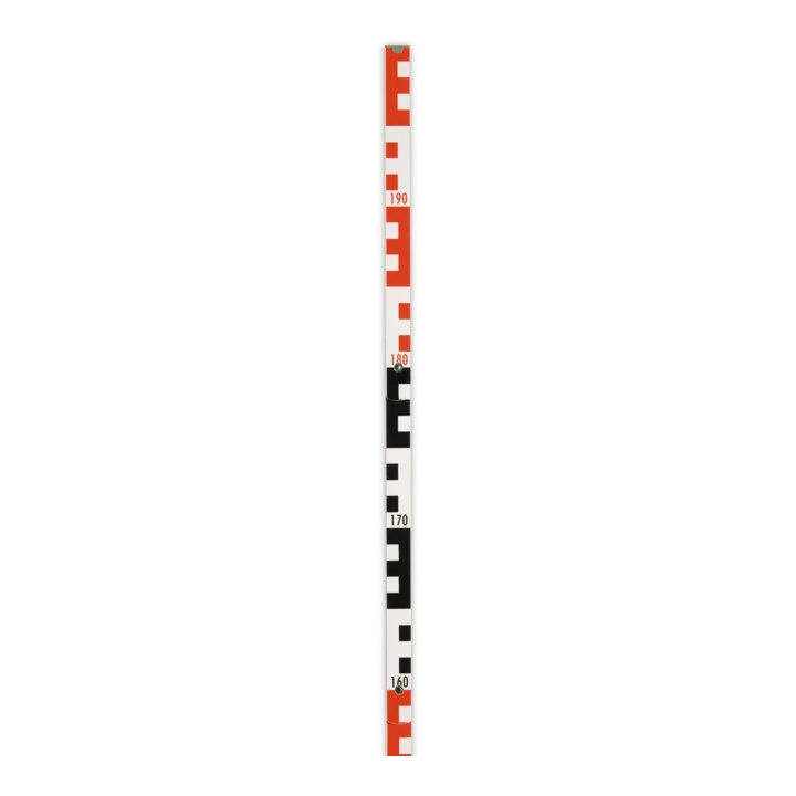 - Maßstab mit Fernsichtskala (E-Teilung) für den Einsatz mit einem optischen Nivellier, Rückseite mit klassischer metrischer Skala