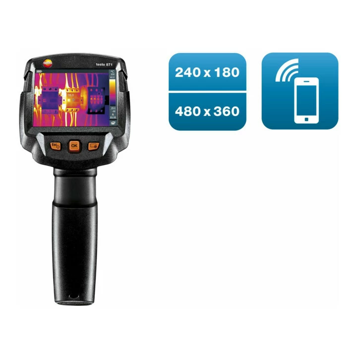 Eigenschaften:Gemeinsam mit unseren Praxis-Profis haben wir die Wärmebildkamera testo 871 entwickelt, damit Sie schnell und einfach mit einer professionellen Wärmebildtechnik arbeiten könnenMithilfe ihrer nützlichen Funktionen erstellen Sie fehlerfreie und objektiv vergleichbare InfrarotbilderMit dem IFOV-Warner, dem testo ɛ-Assist und dem testo ScaleAssist vermeiden Sie Messfehler, und stellen nicht nur mühelos den Emissionsgrad (ɛ) sowie die reflektierte Temperatur (RTC), sondern auch die Farbskala bei der Gebäude-Thermografie optimal ein.Die Wärmebildkamera testo 871 – smart und vernetztDie Wärmebildkamera testo 871 kommuniziert kabellos via WLAN mit Ihren mobilen EndgerätenDie testo Thermography App für iOS und Android bietet Ihnen die Möglichkeit, vor Ort Berichte zu erstellen, zu versenden sowie online zu speichern, und Ihr Smartphone oder Tablet als zweites Display oder Fernbedienung zu nutzenNoch aussagekräftigere Wärmebilder liefert die testo 871 in Verbindung mit der kompatiblen Stromzange testo 770-3 und dem Thermo-Hygrometer testo 605iBeide sind separat erhältlich – bestellen Sie sie einfach gleich mit Ihrer testo 871Die Messergebnisse der beiden Messgeräte können unkompliziert via Bluetooth übertragen werdenMithilfe der ergänzenden Leistungs-, Strom- und Spannungswerte der Stromzange testo 770-3 können gemessene Temperaturen besser interpretiert werdenMessen Sie die Lufttemperatur sowie die Luftfeuchtigkeit mit dem testo 605i und erkennen Sie schimmelgefährdete Stellen anhand der speziellen Feuchtepalette in der Wärmebildkamera einfach per Ampelprinzip.Anwendungsbereich:Leckagen entdecken, Wärmebrücken lokalisieren, Baumängel aufspüren, überhitzte Verbindungen erkennen oder Schimmelschäden beurteilenDie Wärmebildkamera testo 871 ist optimal für Anwendungen rund um die tägliche Wartung und Installation in Handwerk und IndustrieSchnell, einfach und zuverlässig für die Instandhaltung und das Aufspüren von Mängeln.Technische Highlights der Wärmebildkamera testo 871Einfachste Bedienung bei überzeugender Profi-Wärmebildtechnik: Die Wärmebildkamera testo 871 überzeugt durch ihre technischen Features:Sehr gute Bildqualität durch hohe Auflösung: 43.200 Temperaturmesspunkte für präzise ThermografieInfrarotauflösung 240 x 180 Pixel – durch integrierte SuperResolution-Technologie auf 480 x 360 Pixel erweiterbarTemperaturdifferenzen ab 0,09 °C erkennenMit der testo Thermography App vor Ort Berichte erstellen, online speichern sowie per E-Mail versenden und mobile Endgeräte als Zweitdisplay oder Fernbedienung nutzenDrahtlose Kommunikation dank Bluetooth – so können Sie auch kabellos die Messwerte der kompatiblen Stromzange testo 770-3 und des Thermo-Hygrometers testo 605i integrierenIntegrierte Digitalkamera erstellt ein Realbild parallel zum WärmebildDurch eine automatische Hot-Cold-Spot-Erkennung werden kritische Temperaturzustände direkt angezeigtDer testo ScaleAssist stellt die Wärmebildskala automatisch optimal ein, so erstellen Sie objektiv vergleichbare und fehlerfreie Wärmebilder zum Beispiel vom Wärmedämmverhalten von GebäudenFür ein korrektes Messergebnis sorgt der testo ɛ-Assist, indem er den Emissionsgrad sowie die reflektierte Temperatur automatisch ermittelt und einstelltMit dem IFOV-Warner wird der Abstand zum Messobjekt / Messfleckgröße ermittelt und der Messfleck auf dem Wärmebild angezeigt – damit vermeiden Sie Messfehler, denn die Kamera zeigt Ihnen genau, was Sie messen könnenProfi-Software zur Bildauswertung am PCWärmebilder können wahlweise als JPEG gespeichert werdenLieferumfang:Wärmebildkamera testo 871 mit Funkmodul für Bluetooth/WLANUSB-KabelNetzteilLithium-Ionen-AkkuProfi-Software IRSoft (freier Download)3 x testo ε-MarkerInbetriebnahmeanleitungKurzanleitungKalibrierprotokoll und Koffer.