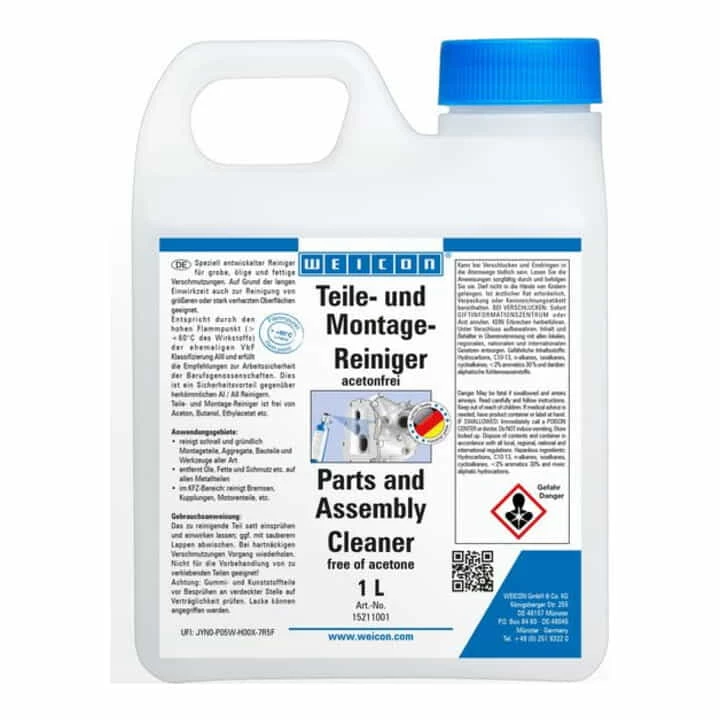 WEICON Teile- und Montagereiniger ist ein speziell entwickelter Reiniger mit hohem Flammpunkt (>+60°C/140°F) des Wirkstoffs und langer Einwirkzeit zur Beseitigung grober, öliger, verharzter und fettiger Verschmutzungen. Teile- und Montagereiniger entspricht durch den hohen Flammpunkt der ehemaligen VbF Klassifizierung AIII und erfüllt die Empfehlungen zur Arbeitssicherheit der Berufsgenossenschaften und ist frei von Aceton, Butanol, Ethylacetat etc. Er reinigt schnell und gründlich Montageteile, Aggregate, Bauteile und Werkzeuge aller Art, entfernt Öle, Fette und Schmutz, etc. auf allen Metallteilen und reinigt Bremsen, Kupplungen, Motorenteile, etc. im KFZ-Bereich.